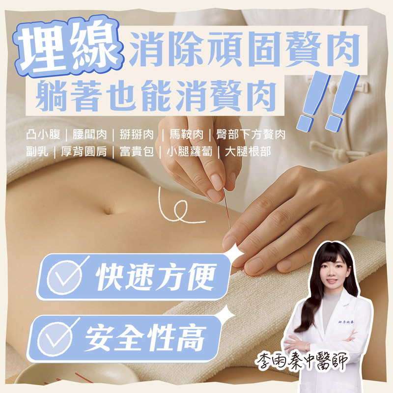 利用特殊針具將可以被人體代謝吸收的羊腸線埋入特定穴位,在穴道內持續刺激經絡功能,提升代謝,加速全身氣血循環,有效改善水腫,小腹、肥手臂等肥胖問題,可以針對頑強難瘦的部位,一一擊破,達到體態雕塑的效果。消除頑固贅肉: