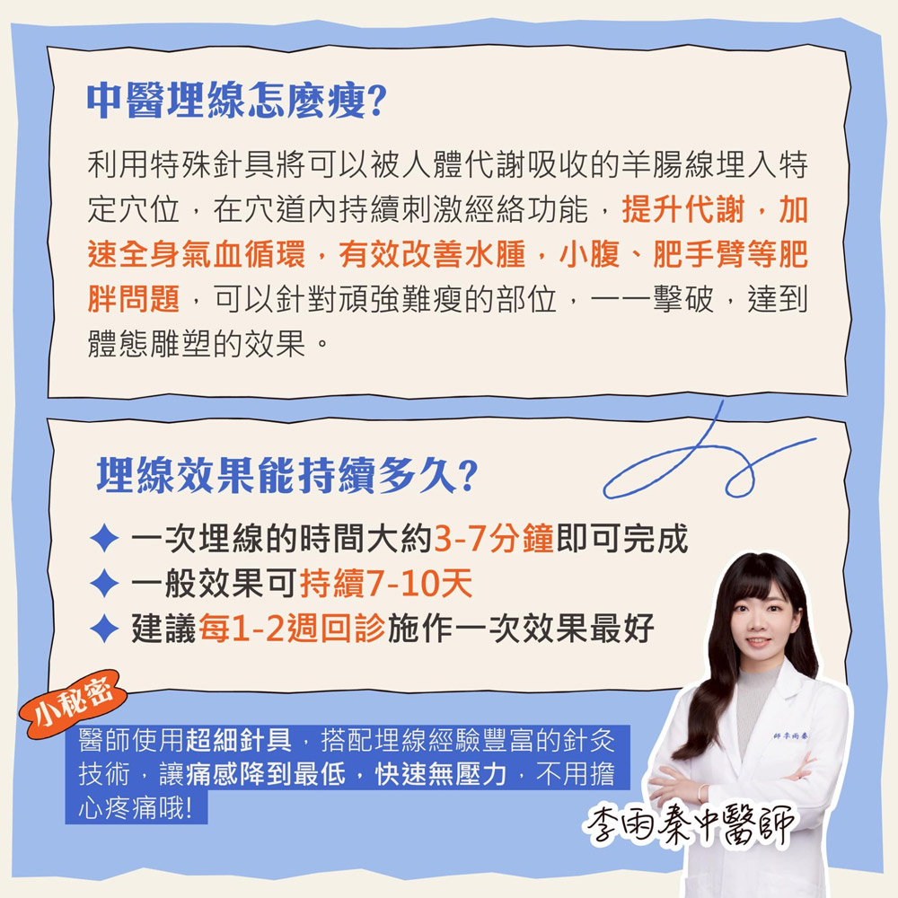 醫師使用較細針具,搭配埋線經驗豐富的針灸技術,讓痛感降到最低,快速無壓力,不用擔心疼痛哦