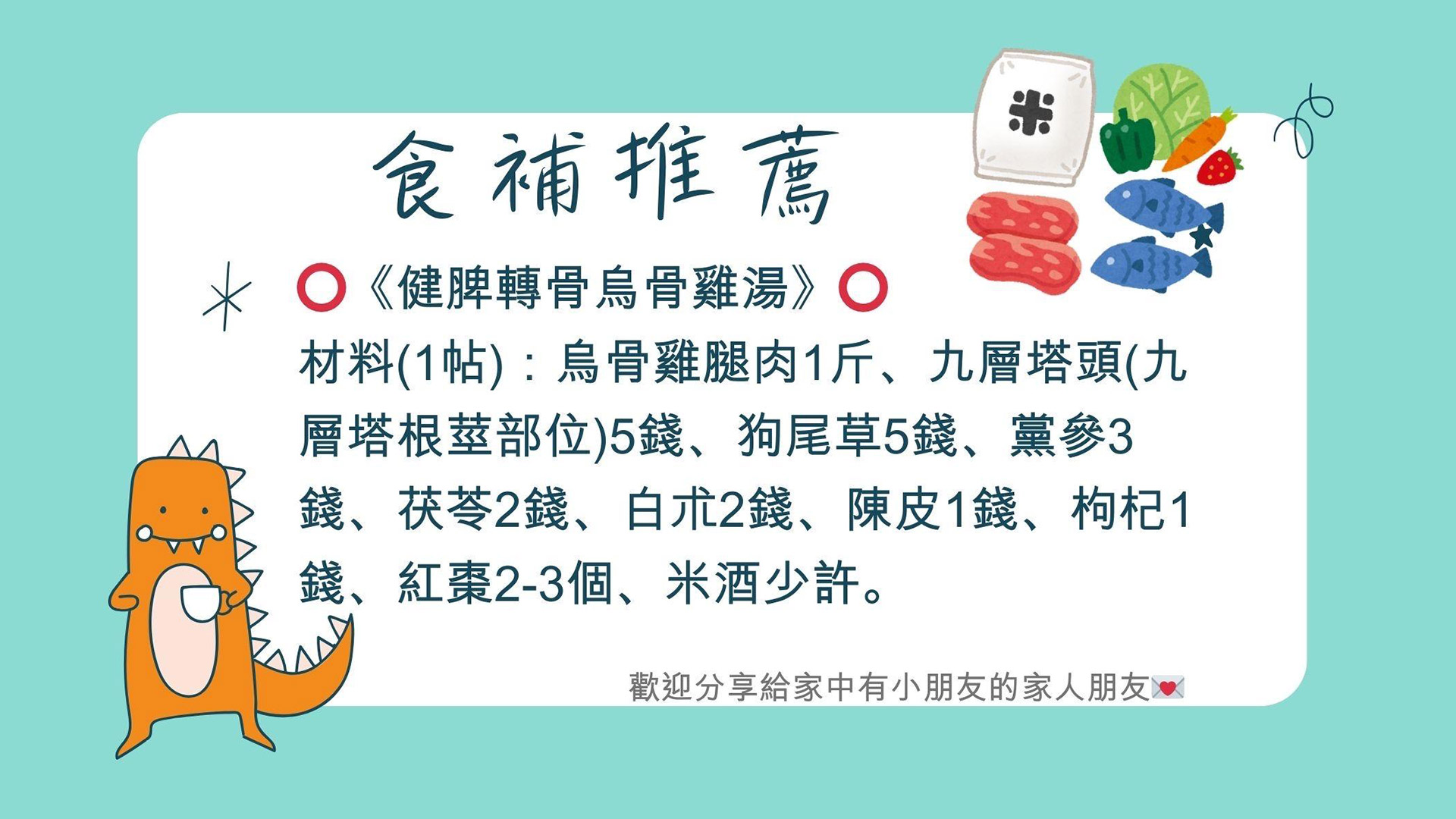 「春夏主生長,秋冬主收藏」,接下來秋冬時節,是補養及轉骨的好時機,服用轉骨藥膳,提早準備,將養分吸收進身體裡,促進春天及夏天的生長發育。平常的食補推薦台灣民間具有開脾功效的中草藥,像是狗尾草、九層塔頭,藥性平和,適合不同體質及不同年齡的小朋友服用,藥材可以與烏骨雞或是排骨燉煮食用,這些中草藥具有獨特的香氣可以增加孩子的食欲,幫助消化,也可以再加一些健脾的中藥材,例如:黨參、白朮、茯苓、神麴、陳皮,增加腸胃功能,幫助養分吸收。